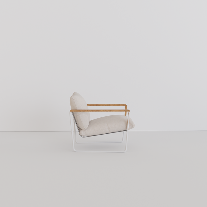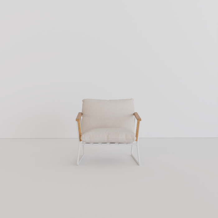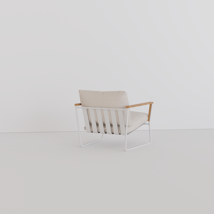 Crafted from powder-coated stainless steel and natural sanded teak, Sora is built to withstand changing climates while maintaining timeless appeal. Plush quick-dry cushions upholstered in high-quality outdoor fabrics ensure comfort and resilience, drying quickly after rain and staying inviting through the seasons. Available as both a 1-seater and 2-seater, its compact yet generous proportions adapt to different spaces with ease.